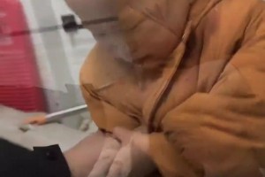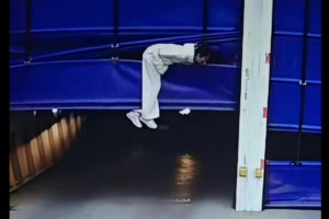 女子钻车库缝出门,下一秒伸缩门突然升起将其挂在空中
